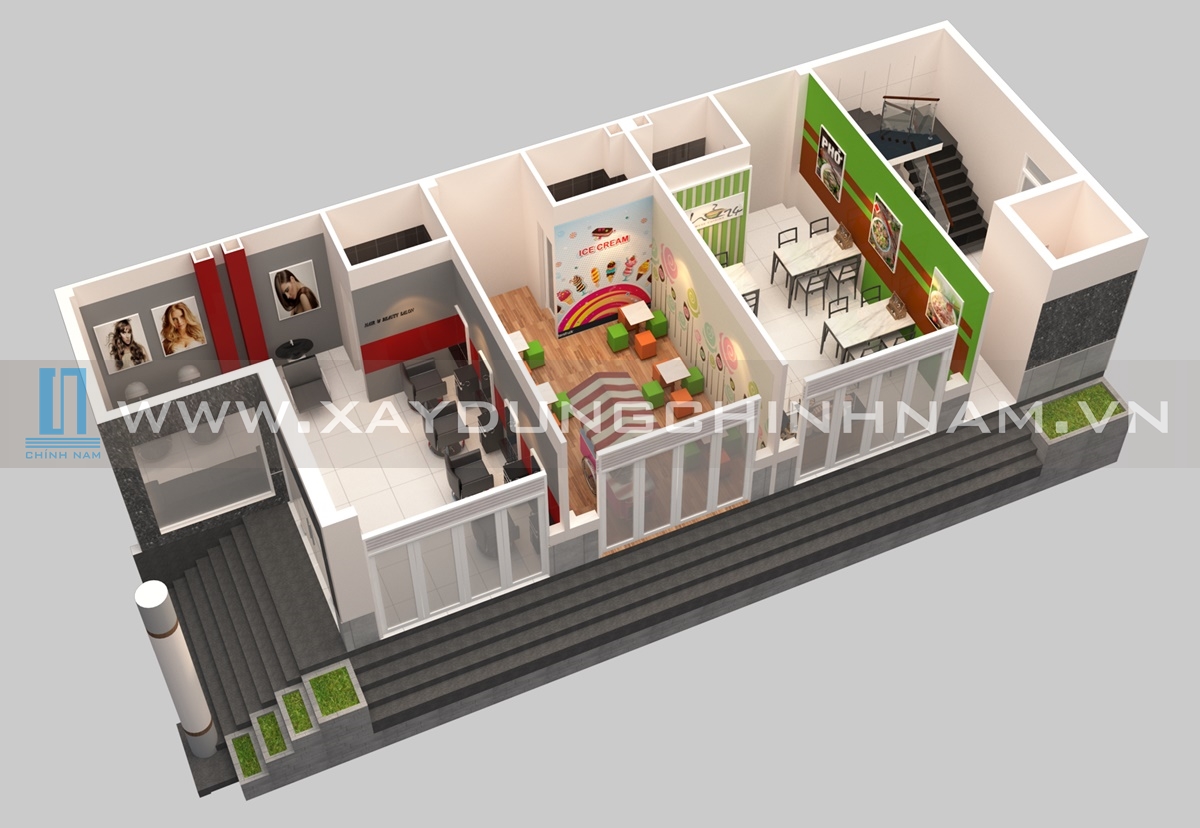 - Tầng trệt: Cho thuê văn phòng kinh doanh, quán ăn, v.v…
